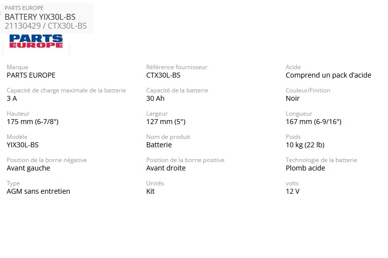 21130429 batterie YIX30L-BS pour Touring à partir de 1997 et Trike à partir de 2009 30Ah oem CTX30L-BS