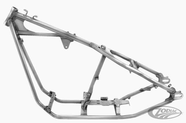 Ces cadres Kraft/Tech sont une autre exclusivité Zodiac. Ces cadres de haute qualité sont fabriqués aux USA en utilisant les meilleurs aciers. Tous les tubes sont cintrés à l'usine puis soudés TIG-MIG avec les meilleurs équipements qui existent. Pour construire un vrai "Bobber" nous proposons ces cadres rigides double berceau droit ou wishbone. Ces cadres Kraft/Tech rigides à double berceau sont disponibles pour moteurs Panhead, Shovelhead et Evolution (Twin Cam avec adaptateur) et acceptent des moteurs jusqu'à .200" plus haut que l'origine.Ces cadres rigides ont de supports moteur rigides déportés qui permettent d'accepter des pneus jusqu'à 180 de large avec courroie sur le berceau droit. Le moteur se monte directement sans aucune modification ni déport. Le support de boite est conçu pour recevoir une boite de vitesse type Evolution Softail. Les plaques de boite et leurs supports sont soudés en place pour procurer la solidité maximum et le meilleur alignement possible. La poutre supérieur fait 1 1/2" avec des supports de réservoir 1986-1999 en acier sont soudés en place . Le cadre comprend aussi des supports de tendeurs pour tendeurs type origine. Les tailles de pneu indiquées sont avec utilisation d'une courroie de 1 1/2" de large. Le cadre pour pneu arrière de 180 de large comprend une axe de roue en 3/4", le cadre pour les pneus jusqu'à 140 utilise un axe de roue arrière ZPN 339067 (OEM 41552-73).
