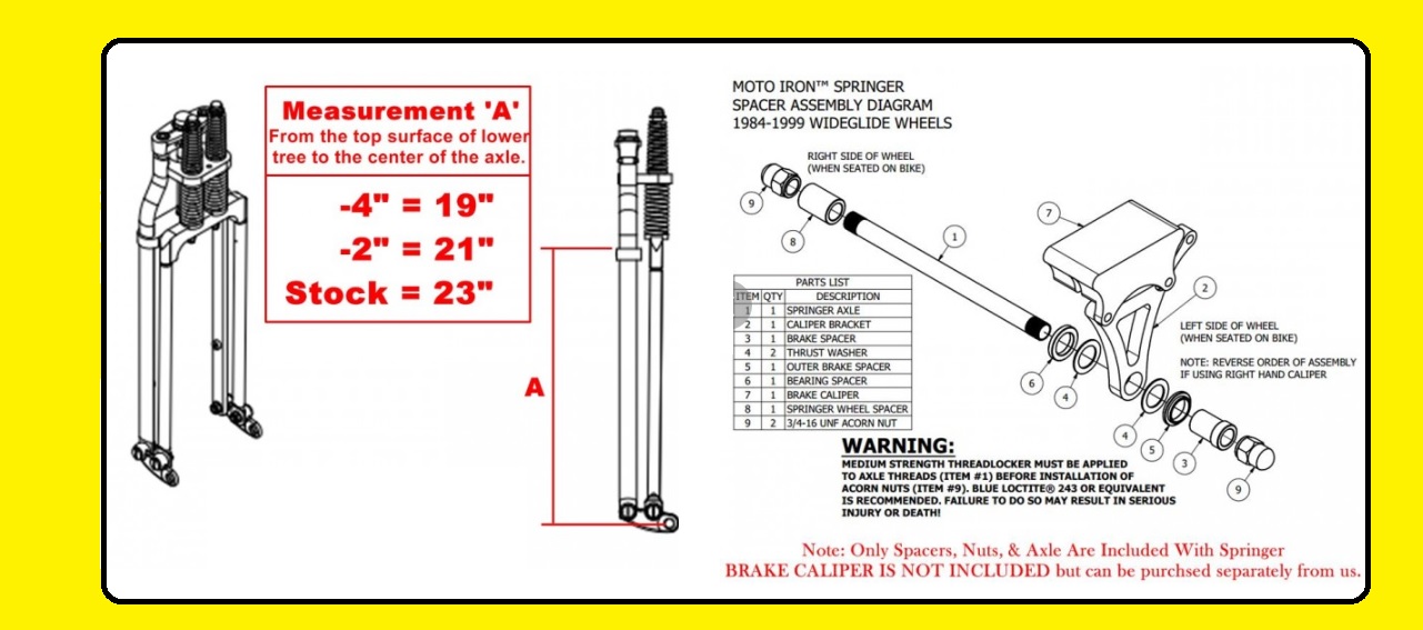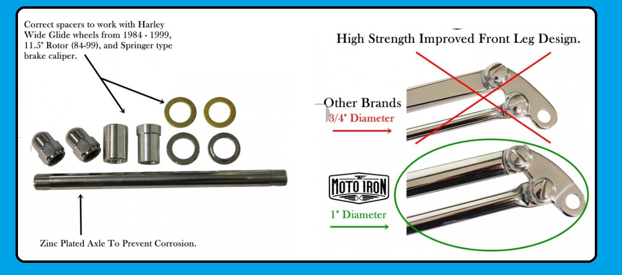 Les entretoises incluses sont conçus pour s’adapter à des roues Harley Wide Glide de 1984 à 1999. Elles travaillent avec un disque de frein Harley (84-99) et frein type Springer d’étrier (voir nos autres annonces pour ces éléments) 11.5".