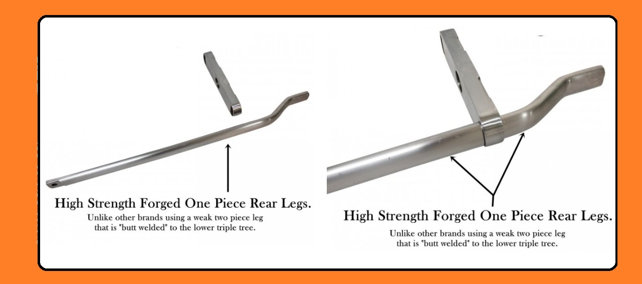 Le tés supérieur accepte vis filetée 1/2"-20 et l’allonge espacement est 4.75 » Centre à Centre (identique à OEM Harley Springers) cette fourche ne convient pas pour xl sportster de 2004 et après à cause de l'angle de rayon et de l' interférence de verrouillage.made in USA..