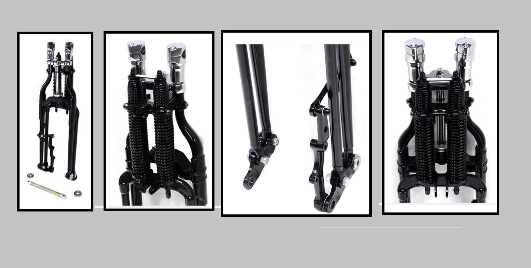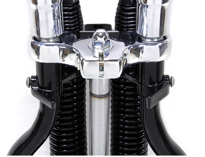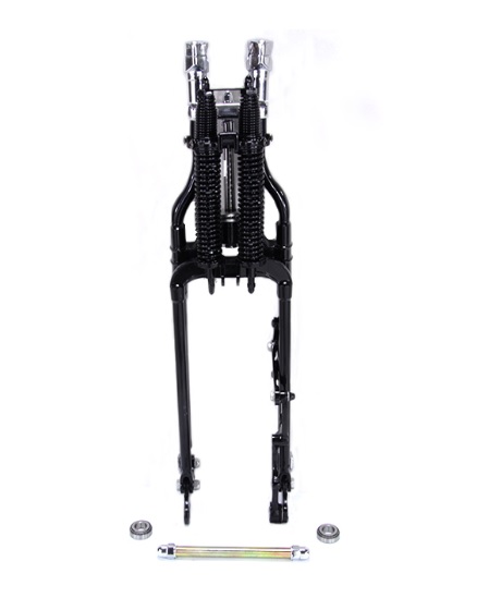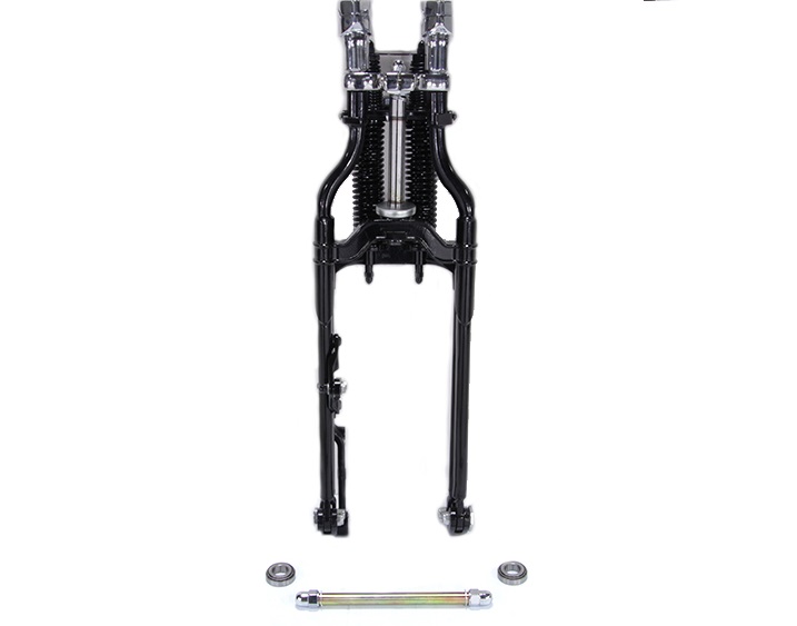L'assemblage complet de la fourche à ressort FLSTS avec finition BLACK est composé de 3 colonnes montantes, de roulements de colonne, de risers ,de bagues, de pare-poussière, d'un arbre supérieur. Les fourches comprennent un axe de roue 3/4 chromé avec écrous borgnes, un support d'étrier et un stabilisateur.