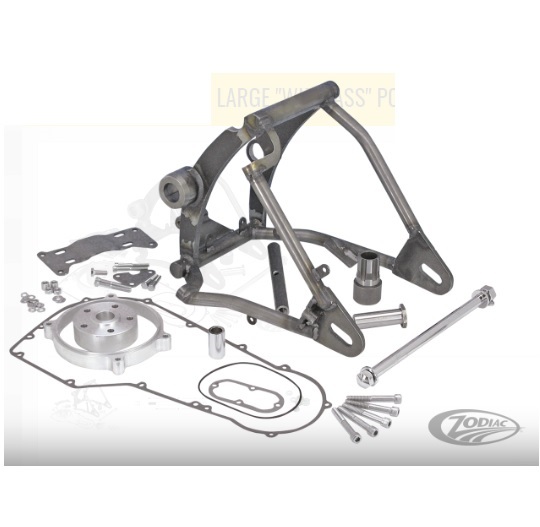 Ce kit très complet avec bras oscillant le plus large possible permettra de monter sur un cadre d'origine un pneu de 200 avec la courroie sans modifications. Quand la courroie est remplacée par une chaîne c'est un pneu de 220/230 que vous pourrez monter. Etant donné que ce kit est extra large le garde boue et les sabres d'origine ne pourront être conservés, des modèles after market extra larges devront être utilisés. Les sabres peuvent être remplacés par les Zodiac 236499. Sur certains modèles vous devrez également meuler la barre de section carrée sur le cadre pour les têtes d'amortisseurs. Pour ce qui est des gardes-boue reportez vous a la rubrique des garde-boue arrière, Zodiac a des gardes-boue jusqu'à plus de 11" (28cm) de large. Chaque kit contient un bras oscillant élargit, tendeurs de chaîne, axe de roue et entretoises, déport de pignon, boulon rallongé, plaque de boite déportée, entretoise de primaire, visserie, joints et joints toriques. Un triangle en acier se fixe sur le coté de la boite de vitesse ce qui vous permet d'éliminer le 5e goujon de boite pour pouvoir monter des amortisseurs d'origine (il faut alors raccourcir les autres goujons).