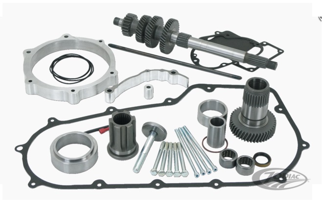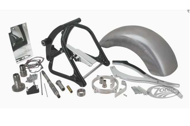 Les kits utilisent le frein arrière stock et comprennent un bras oscillant qui est noir époxy, axe de roue arrière chromé en 3/4'' (19.05mm), caches axe de roue arrière noirs, entretoises de cale-pied arrière noires, pare-boue inox, pare-courroie chromé, rotules de bras oscillant, garde-boue arrière, sabres usinés en aluminium, entretoise de primaire usinée en aluminium, rallonge de vilebrequin en acier, arbre primaire de boite rallongé, pignon de boite rallongé, rallonge d'axe de démarreur ainsi que toute la visserie requise, les joints et joints spys.