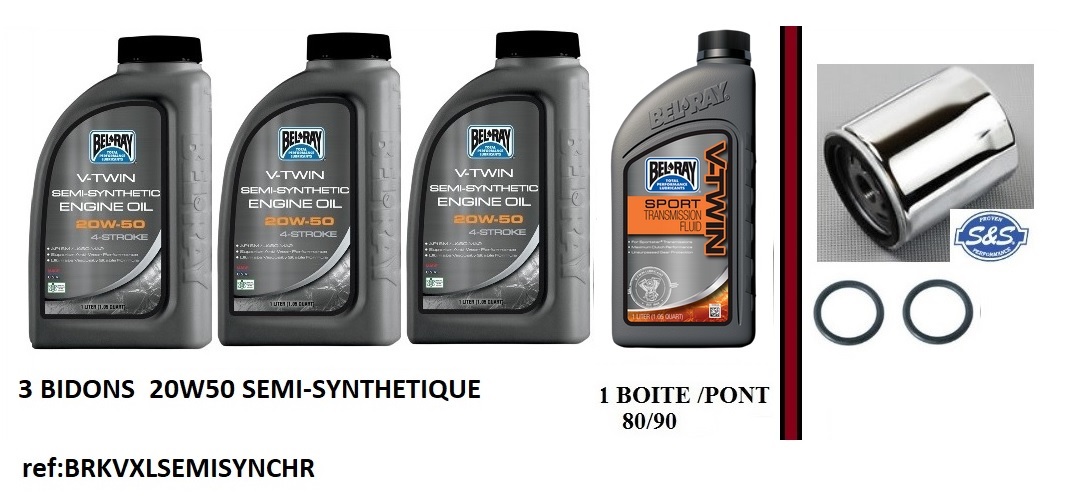 ref:BRKVXLSEMISYNCHR KIT VIDANGE SEMI -SYNTHETIQUE MOTEUR COMPLET ELITE BEL RAY 20W50 POUR XL SPORTSTER A PARTIR DE DE 84 AVEC FILTRE A HUILE S&S CHROME ( moteur+boite et pont)