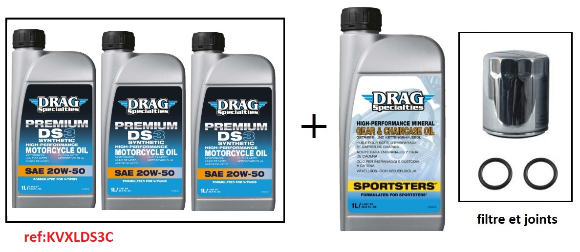 ref:KVXLDS3C KIT VIDANGE MOTEUR COMPLET (MOTEUR+BOITE) HUILE SYNTHETIQUE 20W50 POUR XL SPORTSTER AVEC FILTRE CHROME A PARTIR DE 1984