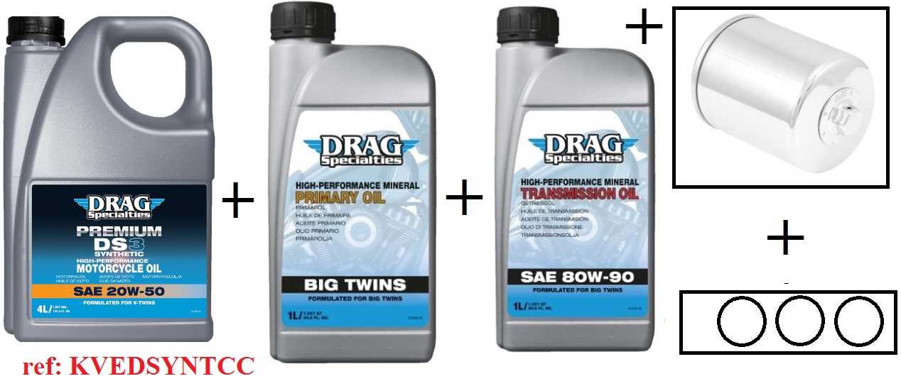ref:KVEDSYNTCC KIT VIDANGE ECO MOTEUR COMPLET (MOTEUR+BOITE+PRIMAIRE) HUILE SYNTHÉTIQUE "DS3"... 20W50 POUR TWIN CAM AVEC FILTRE CHROME K&N ET JOINTS par drag specialties
