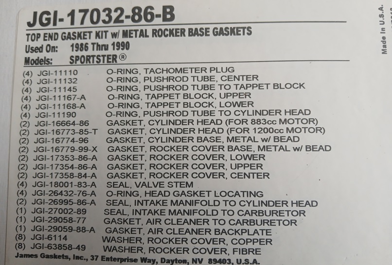 ref:173244 POCHETTE DE JOINTS HAUT MOTEUR RENFORCE MLS POUR SPORTSTER XL883 ET 1200 DE 1986 A 1990 TYPE OEM 17032-86-B MLS PAR james gasket