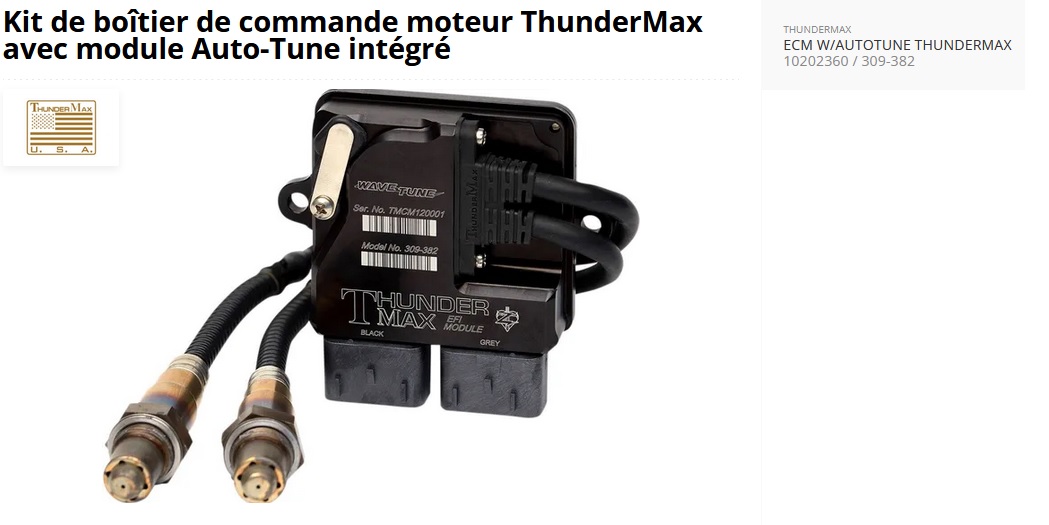 • Comprend l'ECM ThunderMax avec module Auto-tune, un faisceau et deux capteurs à piste large, le logiciel TMax software et un câble USB de communication, un guide de démarrage rapide et un manuel de l'utilisateur exhaustif, un support technique ainsi que des logiciels et mises à jour gratuits