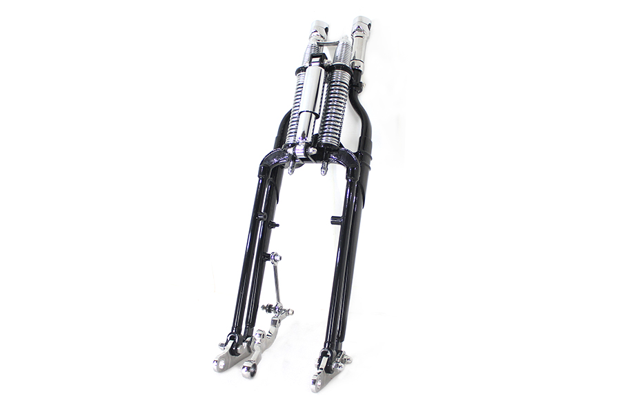 ref:49-0844 FOURCHE SPRINGER NOIR ET CHROME COMPLETE POUR FXST DE 88 A 06 AVEC RISERS ET SUPPORT ETRIER DE FREIN ET AMORTISSEUR CENTRAL (LONGUEUR STOCK 27") PAR VTWIN MANUFACTURI