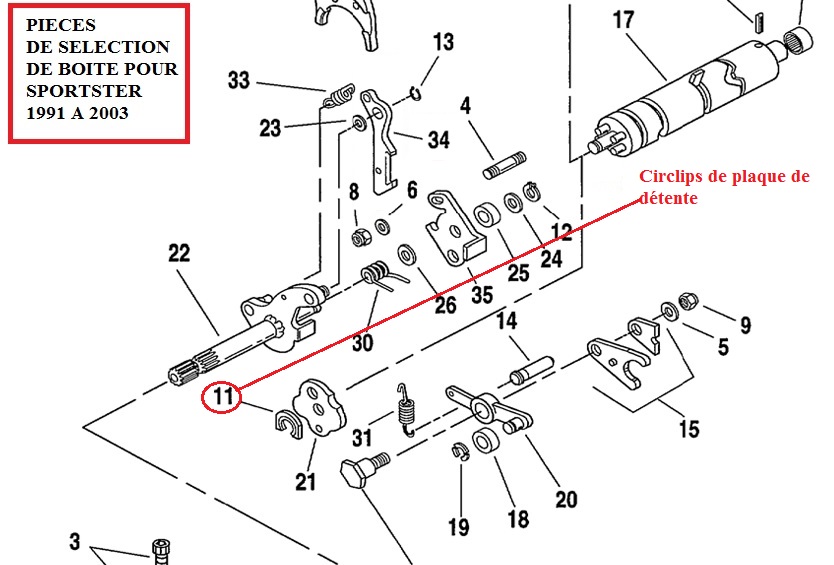 ref:750980 PIECES DE SELECTION DE BOITE POUR SPORTSTER DE 1991 A 2003 OEM 11019 ..."Circlips de plaque de détente"