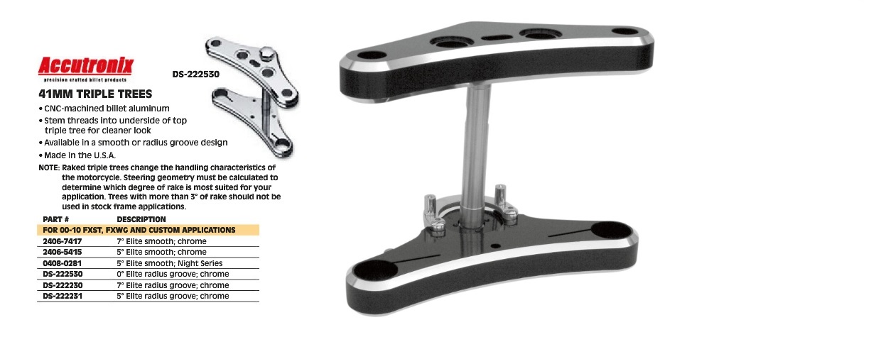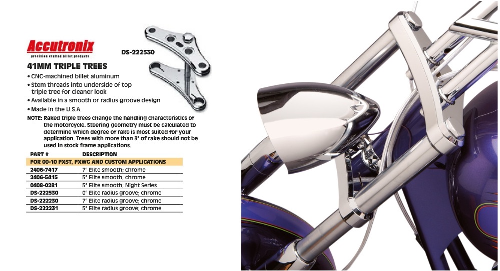 TRIPLE ARBRES DE 41MM REMARQUE: Les arbres triples inclinés changent les caractéristiques de maniabilité de la moto. La géométrie de la direction doit être calculée pour déterminer le degré de râteau le mieux adapté à votre application. Les arbres avec plus de 3 ° de râteau ne doivent pas être utilisés dans les applications de cadres de stock.